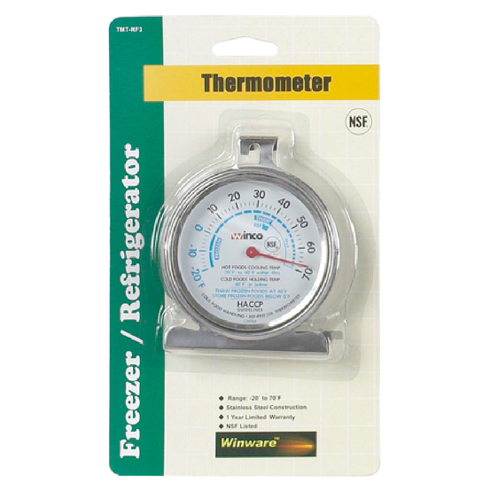 The Winco TMT-RF3 Refrigerator/Freezer Thermometer is a reliable instrument designed to ensure accurate temperature monitoring within a broad range of -20° to 70° F. Featuring a 3-inch diameter dial face, this thermometer offers a clear and easy-to-read display, ensuring precise readings that are critical for maintaining optimal food safety standards. It includes a built-in hanging hook and standing panel, providing versatile placement options to suit varied refrigeration and freezer configurations. This adaptability makes it a valuable asset in commercial kitchens, catering operations, and any industry where temperature control is paramount. The thermometer is HACCP-compliant, highlighting its alignment with international food safety protocols, and it is NSF certified, assuring users of its quality and safety. These certifications underline its suitability for professional environments that prioritize health regulations. Whether you're operating a restaurant, a hospital kitchen, or a food processing unit, the Winco TMT-RF3's robust construction and reliable performance make it an indispensable tool for safeguarding food integrity and ensuring compliance with stringent safety standards. Its practical design and durable functionality cater to the specific needs of diverse market segments, reinforcing its reputation as a trusted choice for temperature management in professional settings.
