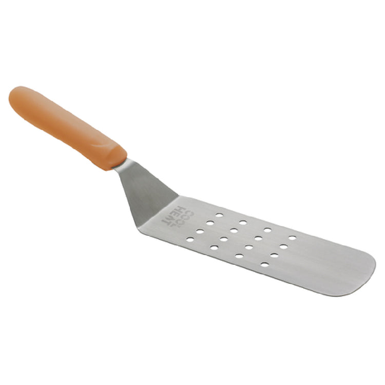 The Winco TNH-91 Turner 8-1/4" X 2-7/8" Perforated is a versatile kitchen tool designed to meet the demands of both professional and home chefs. This turner features an 8-1/4 inch long by 2-7/8 inch wide perforated blade, ideal for flipping and serving a variety of foods with ease. The blade's perforations allow for efficient drainage of excess oil or liquid, enhancing the cooking and serving process. Crafted from high-quality stainless steel with a satin finish, this turner offers durability and a sleek, polished appearance. The flexible offset blade design provides precision and control, making it suitable for delicate tasks such as flipping fish or pancakes. The dual textured orange nylon handle is heat tolerant up to 500°F, ensuring safe and comfortable handling even in high-temperature cooking environments. Dishwasher safe, the Winco TNH-91 Turner is easy to clean and maintain, making it a practical choice for busy kitchens. Furthermore, the turner is NSF certified, verifying its adherence to strict public health standards. This product serves as a reliable tool for culinary professionals, enhancing efficiency and precision in food preparation and presentation across various culinary settings.