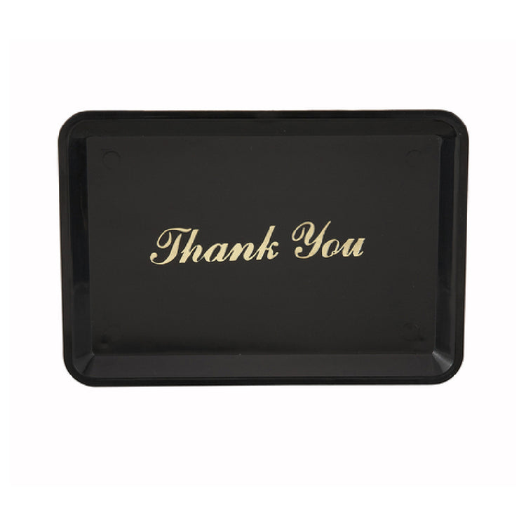 The Winco TT-46 Tip Tray 4-1/2" x 6-1/2" Rectangular is a precision-crafted accessory designed to enhance service efficiency across various hospitality sectors. With dimensions of 4-1/2 inches by 6-1/2 inches, this tip tray offers ample space for presenting checks and gratuities in a professional manner. Crafted from durable plastic, it combines longevity with practicality, making it an ideal choice for high-traffic environments such as restaurants, cafes, and bars. The sleek black finish adds a touch of elegance, while the gold imprint - "Thank You" - delivers a courteous message to patrons, reinforcing customer satisfaction and appreciation. Its lightweight construction allows for ease of handling, optimizing service speed and efficiency. The Winco TT-46 is more than just a tip tray; it is a subtle yet impactful tool that contributes to the overall dining experience, reflecting a commitment to quality and detail that diners will appreciate. This tip tray seamlessly integrates into any tabletop setting, enhancing both aesthetic appeal and functional utility for industry professionals who value reliable and aesthetically pleasing service accessories.