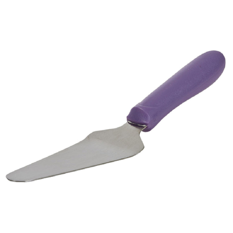 The Winco TWP-51P Pie Server is crafted with precision for professional kitchens and passionate home bakers alike. Featuring a high-quality stainless steel blade measuring 4-5/8" x 2-3/8", this pie server ensures durability and effective performance in every use. The stainless steel construction not only enhances its strength but also contributes to its allergen-free nature, making it a safe choice for diverse culinary environments. This pie server is equipped with a slip-resistant, polypropylene handle in a vibrant purple color that enhances grip and handling, ensuring user safety during serving tasks. The ergonomic design of the handle, coupled with its dishwasher-safe property, makes maintenance and usability remarkably convenient. The tool is NSF certified, signifying its compliance with high public health and safety standards. This makes the Winco TWP-51P Pie Server a reliable and efficient tool for various segments in the food industry, particularly in settings where safety and hygiene are of paramount importance. Its thoughtfully designed features cater to the needs of commercial kitchens, bakeries, and catering services, providing them with a robust yet elegant solution for serving pies with precision and ease.