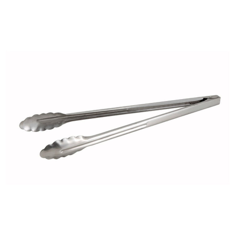 Winco UT-16HT Utility Tongs 16" Coiled Spring are engineered for superior performance and durability, catering to the diverse needs of culinary professionals across various industry segments. Constructed with extra heavy weight 1.2 millimeter stainless steel, these tongs offer exceptional strength and resilience, making them an ideal choice for high-volume kitchens where reliability is paramount. The 16-inch length provides optimal reach and control, allowing chefs to handle food with precision and confidence. Featuring a coiled spring mechanism, the tongs ensure smooth operation and a firm grip, enhancing their usability in fast-paced environments. The scalloped edge design further enhances the grip on food items, whether delicate or robust, ensuring safe and efficient handling. These utility tongs are a versatile tool, suited for grilling, sautéing, and serving, making them indispensable in restaurants, catering services, and other food service establishments. Their robust stainless steel construction not only ensures longevity but also makes them easy to clean, maintaining hygiene standards essential in the food industry. Winco UT-16HT Utility Tongs are the perfect blend of functionality and durability, designed to meet the rigorous demands of professional chefs and caterers alike.