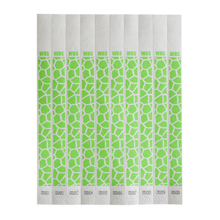 Bar Maid WB-100G-D Bar Maid Wristbands 3/4"W X 9.5"L Tyvek (No Tear) are unique identification solutions tailored for diverse industries, ensuring heightened security and event management efficiency. Crafted from durable Tyvek material, these wristbands boast a no-tear feature, making them a reliable choice for event organizers and venue managers seeking to prevent unauthorized access. Each band measures 3/4" in width and 9.5" in length, providing a comfortable fit for users while maintaining visibility for security personnel. The sequentially numbered design offers a streamlined method for tracking and managing entry, enhancing organizational procedures at concerts, festivals, or corporate events. Available in a vibrant green design, these wristbands not only fulfill a functional role but also contribute to the event's aesthetic appeal. Packaged in quantities of 500 bands per pack, with a quantity break at 2 packs, the Bar Maid WB-100G-D wristbands provide a cost-effective solution for large-scale events requiring substantial quantities of reliable identification bands. Their robust design and thoughtful features make these wristbands an indispensable tool for any industry segment focused on security, identification, and crowd management.