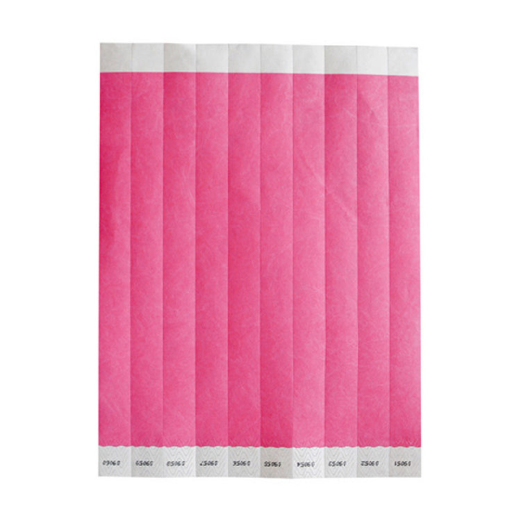 The Bar Maid WB-100PI-S Bar Maid Wristbands 3/4"W X 9.5"L Tyvek (No Tear) are durable and reliable identification solutions perfect for various event management needs. These wristbands are crafted from high-quality Tyvek material, known for its strength and resistance to tearing, making them suitable for environments requiring secure and tamper-proof identification. Each wristband measures 3/4 inches in width and 9.5 inches in length, providing a comfortable fit for most wrist sizes. The sequential numbering on each band offers an added layer of security, allowing for easy tracking and management of attendees. With a solid pink color, these wristbands are highly visible, ensuring easy identification from a distance. Packaged in quantities of 500 bands per pack, these wristbands are available with a quantity break of 2 packs, making them an economical choice for large-scale events. Designed for versatility, the Bar Maid WB-100PI-S wristbands are ideal for use in a wide range of settings, including concerts, festivals, corporate events, and more. Their tear-resistant design and sequential numbering make them a practical and efficient solution for managing access and enhancing security at any event.