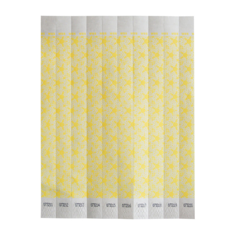 The Bar Maid WB-100Y-D Bar Maid Wristbands 3/4"W X 9.5"L Tyvek (No Tear) are a versatile solution for managing access and organizing events across various industry segments. These wristbands measure 3/4 inches in width and 9.5 inches in length, providing a secure fit for most wrist sizes. Made from Tyvek material, they boast a no-tear design, ensuring durability and longevity even in demanding settings. Each wristband is sequentially numbered, offering an efficient way to keep track of attendees or participants at any event, whether it's a large concert or a small corporate gathering. The vibrant yellow design ensures high visibility, making it easy to identify authorized individuals quickly. With a pack containing 500 bands, and a quantity break set at two packs, this product caters to both small-scale and large-scale requirements efficiently, providing flexibility and scalability. The Bar Maid WB-100Y-D wristbands are an ideal choice for event organizers, security personnel, and entertainment venues that require reliable and straightforward identification solutions. These bands combine practicality with durability, making them a valuable tool in maintaining organization and enhancing security measures.