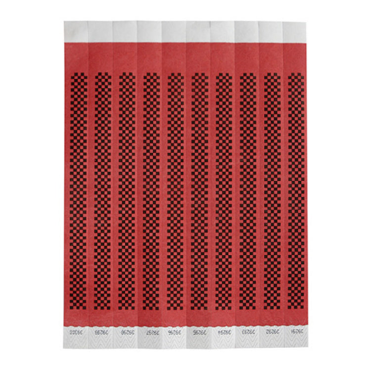 Bar Maid WB-CHECKER Bar Maid Wristbands 3/4"W X 9.5"L Tyvek (No Tear) are an essential tool for efficient crowd management and identification across various events, catering to the needs of event organizers, venues, and businesses within the hospitality industry. These wristbands are meticulously crafted from Tyvek material, renowned for its strength and durability, ensuring they are tear-resistant and long-lasting, even in demanding environments. Each band measures 3/4 inches in width and 9.5 inches in length, providing a comfortable and secure fit for all wrist sizes, while allowing for easy application and removal. The sequential numbering feature adds an additional layer of security and organization, simplifying the tracking process and enhancing event management efficiency. The distinctive red and black checkerboard design not only aids in quick visual identification but also adds a touch of vibrant style. Sold in packs of 500 bands, with a quantity break at two packs, these wristbands offer a cost-effective solution for large-scale events. The Bar Maid WB-CHECKER wristbands are ideally suited for a wide range of applications, from concerts and festivals to corporate events and private functions, providing a reliable and practical solution for managing admission and access control effortlessly.