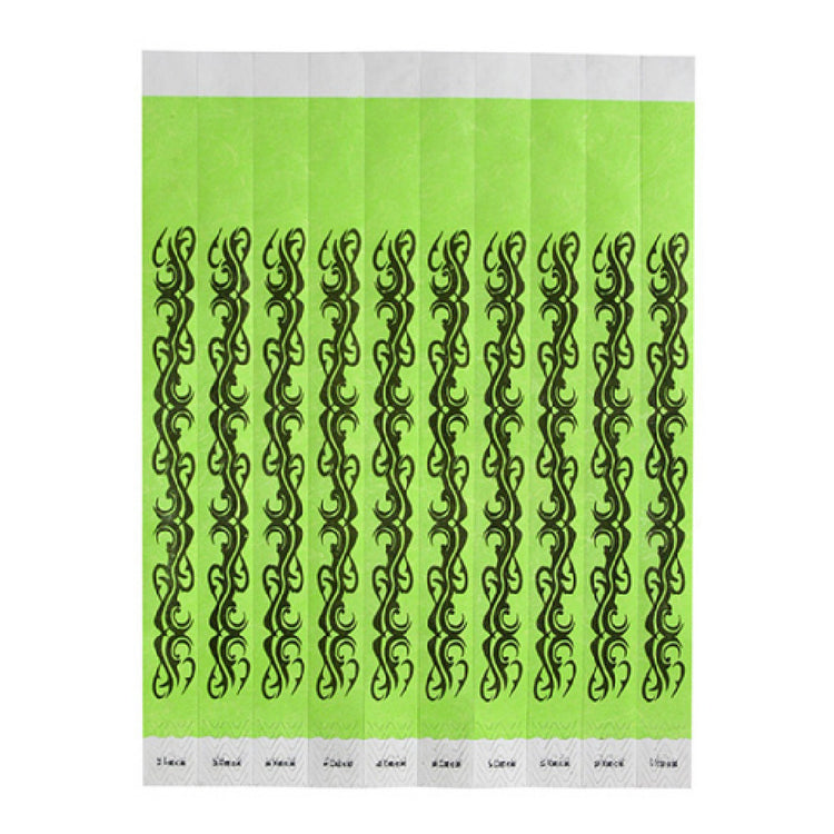 The Bar Maid WB-TATTOO Bar Maid Wristbands 3/4"W X 9.5"L Tyvek (No Tear) are a durable identification solution designed for events, venues, and security purposes. These wristbands are made from Tyvek, a synthetic material known for its tear-resistant properties, ensuring long-lasting use even in demanding environments. Each wristband measures 3/4 inches in width and 9.5 inches in length, providing a comfortable fit for most wearers. A distinctive feature of these wristbands is their sequential numbering, which aids in crowd management and event security. The tattoo-style design in green and black adds a unique visual appeal, making them ideal for themed events or branding opportunities. Packaged with 500 bands per pack and offering a quantity break at two packs, these wristbands are cost-effective for large events. The Bar Maid WB-TATTOO wristbands are an essential tool within the hospitality and event management industries, providing a reliable method of attendee identification and security. Their no-tear construction and vibrant design cater to various market segments, from large-scale concerts to small private gatherings, ensuring that they meet diverse operational needs with ease and effectiveness.