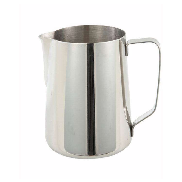 The Winco WP-66 Frothing Pitcher is a 66 oz. stainless steel tool designed to meet the diverse needs of baristas, coffee shops, and home enthusiasts alike. With its substantial 66-ounce capacity, this pitcher is perfect for large-scale milk steaming and frothing, catering to high-demand environments. Made from high-quality stainless steel, it ensures durability and longevity while resisting rust and corrosion, a crucial feature for professional settings. The sleek, polished finish not only adds a touch of elegance but also facilitates easy cleaning, maintaining a pristine appearance over time. Its ergonomic design offers a comfortable grip, enhancing precision during pouring, which is essential for crafting intricate latte art. This versatile frothing pitcher supports both novices and professionals in achieving consistent milk texture, a key factor in delivering premium coffee experiences. Ideal for cafes, restaurants, or home kitchens, the Winco WP-66 Frothing Pitcher stands out for its large capacity and robust construction, meeting the demands of various market segments within the food and beverage industry. Whether you are frothing milk for a bustling café or perfecting your home-brewed latte, this pitcher is engineered to perform with excellence, providing a reliable solution for all frothing needs.