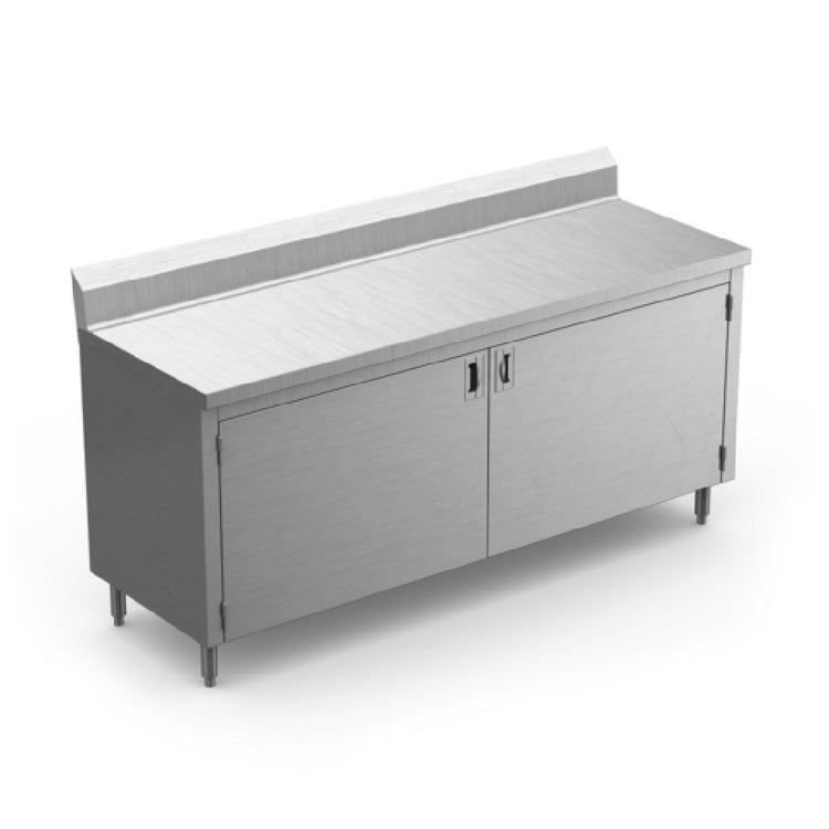 The Winholt STCT-BBHD3048-MS Enclosed Table 5" Boxed Back Splash Mid-shelf is a meticulously engineered piece of equipment, ideal for diverse commercial kitchen settings. This table boasts a 5-inch boxed back splash, ensuring effective containment of spills and facilitating easy cleanup, a feature highly valued in busy culinary environments. Designed with a mid-shelf, it maximizes storage space, allowing for efficient organization of kitchen essentials. The table is equipped with two hinged doors, providing easy access to the enclosed storage area, making it an excellent choice for maintaining a tidy workspace. Its bullet feet are adjustable up to 1-3/8 inches, allowing for stability on uneven floors, and ensuring the unit remains firm during high-volume operations. Crafted from all welded 16-gauge stainless steel, it offers exceptional durability and resistance to corrosion, which is crucial in maintaining long-term usability in high-moisture environments. Certified by NSF, the Winholt STCT-BBHD3048-MS adheres to rigorous safety and sanitation standards, making it a reliable addition to any professional kitchen. This product is an exemplary model of quality and functionality, tailored to meet the diverse needs of the foodservice industry.