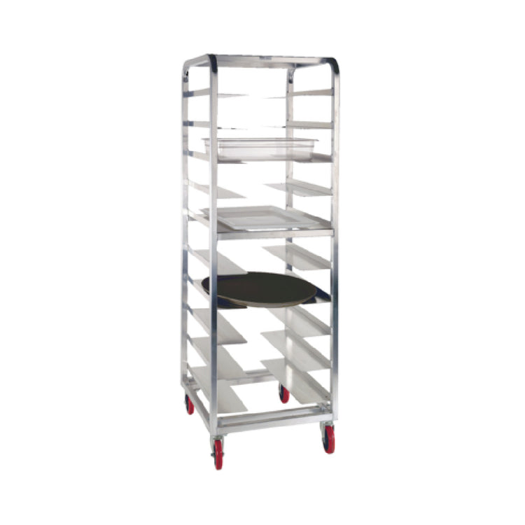 The Winholt UAR-1023 Universal Pan Rack is a robust piece of equipment specifically designed for efficiently organizing and storing sheet pans. This practical pan rack holds up to ten 18" x 26" sheet pans, making it an indispensable asset for bustling commercial kitchens and bakeries. With a width of 27 inches, a depth of 26 inches, and a towering height of 70 inches, it offers ample vertical storage space while maintaining a compact footprint. The pan rack features a 6-inch runner spacing, ensuring adequate air circulation between pans and facilitating cooling processes. Its all-welded aluminum construction ensures durability and longevity, making it an ideal investment for high-volume use. Equipped with four 5-inch polyurethane swivel stem casters, the rack provides easy maneuverability, allowing for effortless transport across different kitchen areas. This pan rack is NSF certified, guaranteeing that it adheres to strict public health and safety standards. The Winholt UAR-1023 Universal Pan Rack is a versatile storage solution with features that cater to the unique needs of foodservice operations, enhancing workflow efficiency and organization within both small-scale and high-capacity culinary environments.