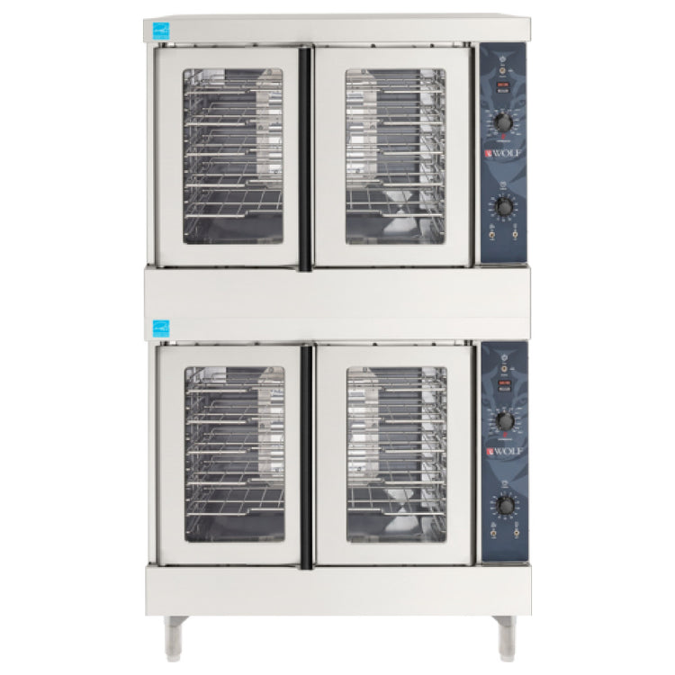 Wolf, WC44ED-QS-COMMANDER_240/60/3, (Quick Ship) Convection Oven, electric, double-deck, standard depth, solid state controls, temperature range 150° to 500°F, 60 minute timer with audible alarm per oven, oven cool switch for rapid cool down, independently operated stainless steel doors with double pane windows, porcelain enamel on steel oven interiors, (5) nickel plated racks per oven, stainless steel front, top, sides & 8"H legs, (2) 1/2 HP two speed oven blower-motors, 12 kW each section, NSF, cUL, UL, ENERGY STAR®