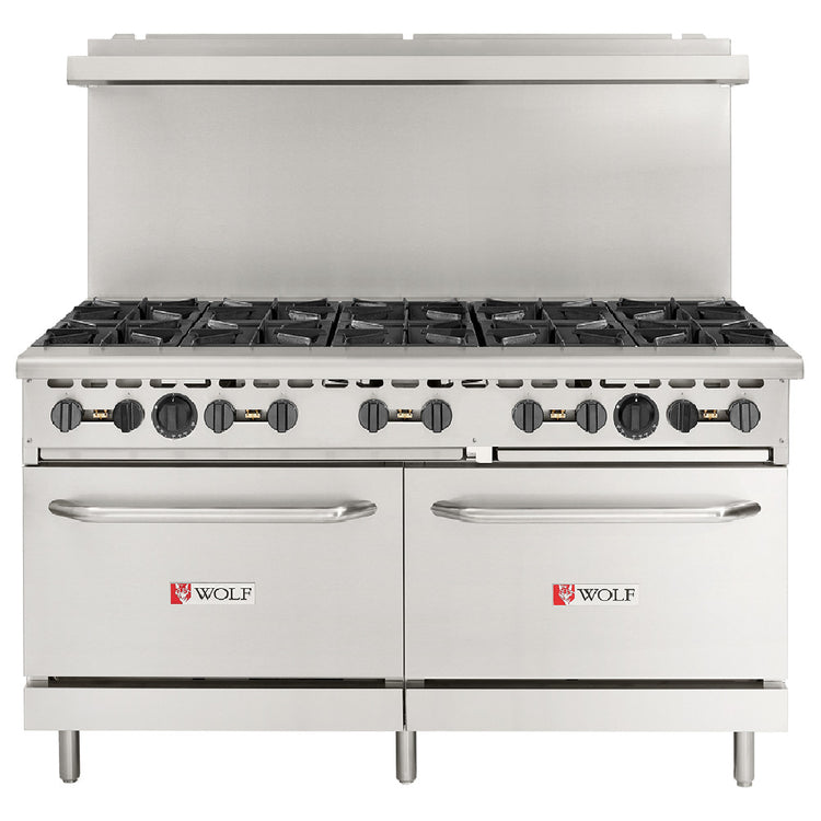 The Wolf WX60-10BP WX Series Restaurant Range is a powerful and versatile cooking solution designed for professional kitchens. This 60-inch range operates on propane gas and features an impressive array of ten 28,000 BTU burners, each equipped with lift-off burner heads for easy cleaning and maintenance. The range includes two standard ovens, providing ample cooking and baking capacity for high-demand environments. Constructed with a durable, fully MIG welded frame, the Wolf WX60-10BP ensures stability and longevity in bustling kitchen settings. Its sleek design includes a stainless steel front, sides, backriser, and high shelf, offering a modern and professional appearance. The 6-inch adjustable legs allow for customized height adjustments to fit various kitchen setups. With a total output of 340,000 BTU, this range is ETL-Sanitation certified, meeting industry standards for cleanliness and safety. The Wolf WX60-10BP is an ideal choice for restaurants seeking a reliable and efficient range that can handle a variety of cooking tasks with precision and ease.