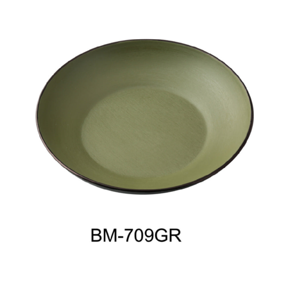 The Yanco BM-709GR Pasta or Salad Bowl is crafted with precision to enhance both functionality and aesthetic appeal. Measuring 9 inches in width and depth and 1-3/4 inches in height, this bowl offers a generous 30-ounce capacity, making it ideal for serving substantial portions of pasta or salad. Constructed from durable melamine, the bowl is designed to withstand the rigors of daily use while maintaining its elegant appearance. Its two-tone Birmingham Green design adds a touch of sophistication to any table setting. The bowl is dishwasher safe, ensuring easy and efficient cleaning, which is particularly beneficial in high-volume settings. Sold by the case, with each case containing 2 dozen bowls, this product is a practical choice for commercial dining establishments, catering events, and large family gatherings. Its round shape promotes even mixing and presentation of dishes, enhancing the dining experience. The Yanco BM-709GR bowl seamlessly combines style and durability, making it a valuable addition to both professional and home kitchens that prioritize quality and aesthetic appeal in their serveware collections.