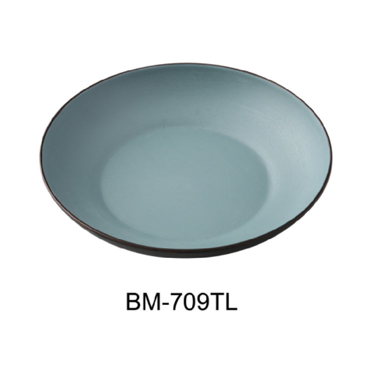 The Yanco BM-709TL Pasta Or Salad Bowl is a versatile dining essential, measuring 9 inches in width and depth, and 1-3/4 inches in height, with a generous 30-ounce capacity. Crafted from durable melamine, the bowl is dishwasher safe, ensuring easy maintenance and longevity in both household and commercial settings. Its round shape and two-tone design in Birmingham Teal add a touch of elegance and style to any table setting, making it suitable for both casual and formal dining experiences. Sold by the case with 2 dozen bowls per case, it is an ideal choice for restaurants, catering services, and large families requiring bulk quantities. The Yanco BM-709TL's combination of size and aesthetic appeal makes it a versatile solution for serving a variety of dishes, from pasta to salads, enhancing both presentation and functionality in any dining environment.