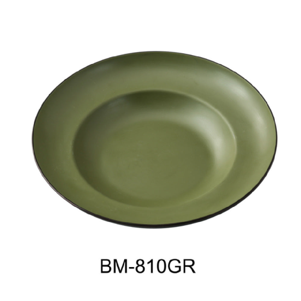 The Yanco BM-810GR Pasta Bowl is a meticulously designed dining accessory, ideal for both residential and commercial settings. With dimensions of 10-3/4 inches in width and depth and a height of 2-1/4 inches, this bowl is well-suited for serving pasta dishes and other culinary creations. Its capacity is 12 ounces, providing ample space for generous servings. Crafted from durable melamine, the bowl is both lightweight and resilient, ensuring longevity even with frequent use. It features a two-tone design in Birmingham Green, adding a touch of elegance to any table setting. The bowl's round shape contributes to an aesthetic appeal while also being highly functional. Dishwasher safe, it offers convenience for busy kitchens, simplifying the cleaning process while maintaining its vibrant finish. Sold by the case, with each case containing 2 dozen bowls, it is a practical choice for restaurants, catering services, and large gatherings. The Yanco BM-810GR Pasta Bowl stands out with its blend of durability, style, and utility, making it a versatile addition to any dining ware collection, particularly appealing to those in the food service industry who value efficiency and design.