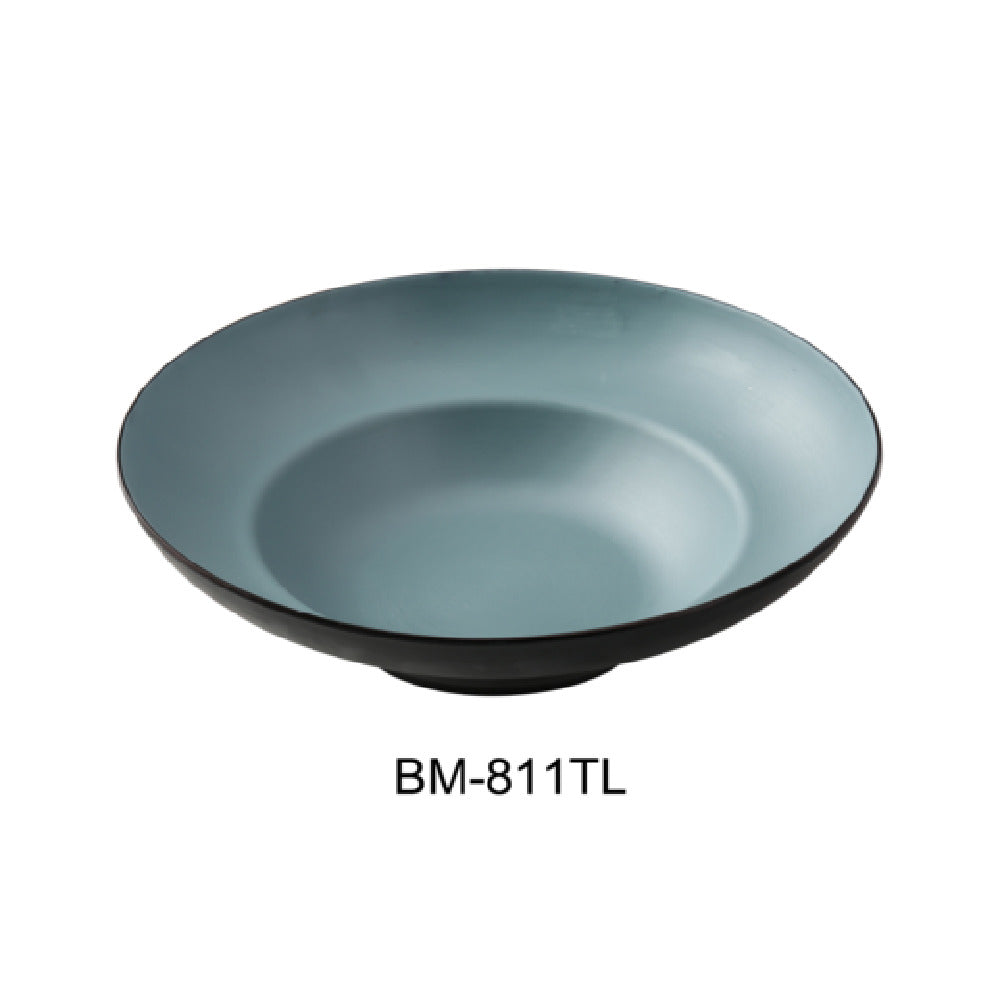 The Yanco BM-811TL Pasta Bowl is an elegant serving solution with precise dimensions of 11-1/8"W x 11-1/8"D x 3-1/4"H, designed for versatile dining settings. This bowl's 20 oz capacity makes it perfect for comfortably holding generous servings of pasta, salads, or other culinary delights. Constructed from durable melamine, the Yanco BM-811TL is not only lightweight but also resistant to breakage, providing a safe and practical choice for both high-paced commercial environments and home kitchens. Its dishwasher-safe feature ensures easy maintenance and longevity, a crucial aspect for food service operations seeking efficiency. The bowl showcases a stylish two-tone design in Birmingham Teal, adding a pop of color to table settings and enhancing food presentation. Sold by the case, each containing a dozen, this pasta bowl is ideal for bulk purchase, catering to the needs of restaurants, caterers, and event planners who require consistency and quality in their tableware. The Yanco BM-811TL Pasta Bowl seamlessly combines functionality with aesthetic appeal, making it a valuable asset for diverse market segments within the restaurant and hospitality industry.
