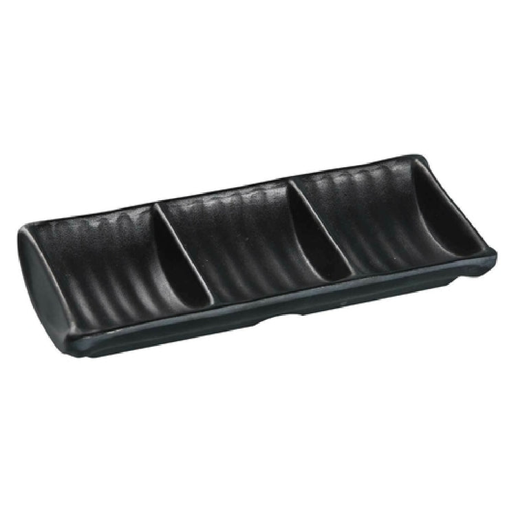 The Yanco BP-4030 Black Pearl Sauce Dish is a versatile and stylish addition to any dining setting, particularly suited for Asian cuisine presentations. With a capacity of 2-1/2 oz., this dish offers the perfect size for serving sauces and condiments. The dimensions of 7-1/2"L x 3-1/2"W emphasize its rectangular shape, which is further enhanced by three separate compartments. This design not only facilitates an organized and elegant presentation but also allows for a diverse range of sauces to be served simultaneously. Crafted from melamine, the Black Pearl Sauce Dish combines durability with an attractive matte surface that mimics the texture of traditional ceramic pieces. Its sleek black color adds a modern touch, making it an attractive option for both commercial and home use. Sold by the case, with each case containing four dozen dishes, the Yanco BP-4030 is an excellent choice for restaurants and catering services that require both style and practicality in bulk quantities. Its Asian-inspired design complements a variety of cuisines, ensuring it is a versatile piece for any culinary establishment looking to enhance their dining experience with a touch of class and functionality.