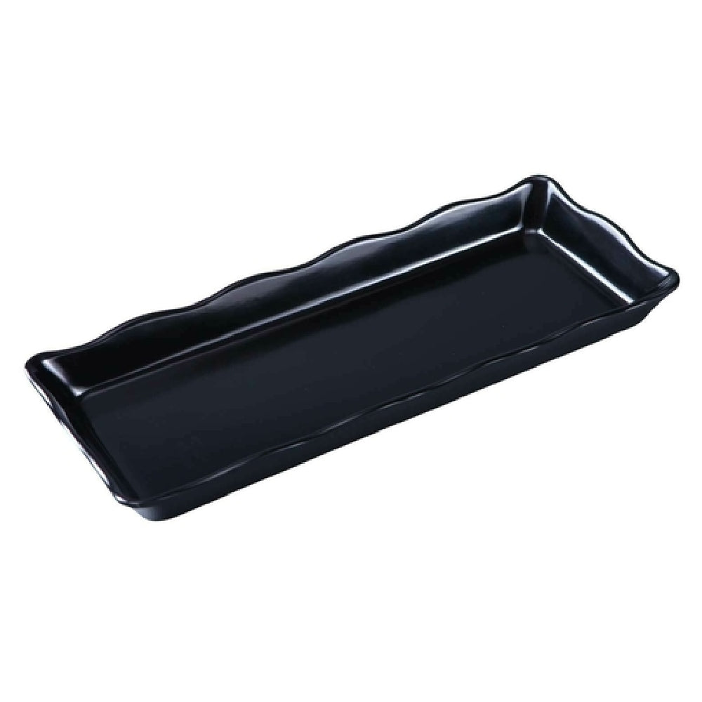 The Yanco DC-6014B Serving Tray is a rectangular platter measuring 14 inches by 5-1/4 inches by 1 inch, crafted to meet the diverse needs of various market segments within the food service industry. Its distinctive scalloped edge design adds a touch of elegance, making it an attractive choice for upscale dining environments or catering services where presentation is key. Made from durable black melamine, this tray combines the aesthetic appeal of ceramic with the practical benefits of lightweight and shatter-resistant construction, ideal for high-traffic settings such as restaurants, hotels, or cafeterias. Sold by the case, with six trays per case, this product is suitable for bulk purchasing by large-scale operations looking to maintain a consistent and professional table setting. The Yanco DC-6014B's dimensions provide ample surface area for serving a variety of dishes, from appetizers to desserts, making it versatile for any meal presentation. Its durable material ensures longevity and resistance to stains and scratches, maintaining its sleek appearance over time. This serving tray is a practical and stylish solution for professional food service establishments that require reliable and visually appealing servingware to enhance their culinary presentations.