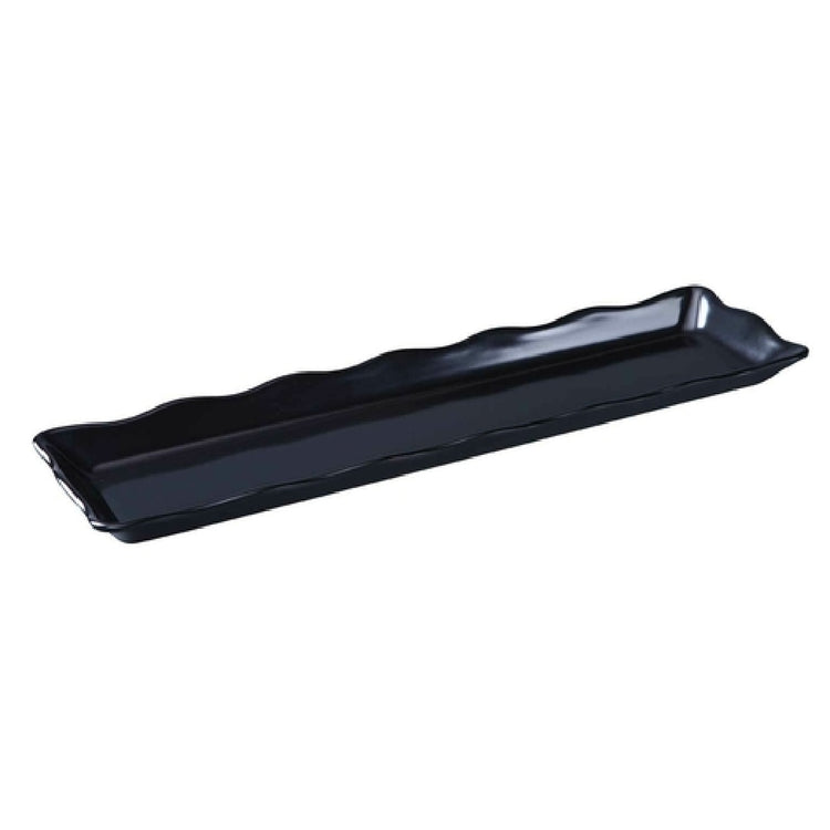 The Yanco DC-6019B Serving Tray is a rectangular tray measuring 19 inches by 5-1/4 inches by 1 inch, uniquely designed with a scalloped edge. Made from durable melamine, this tray is lightweight yet robust, ensuring longevity and ease of use in both commercial and residential settings. The sleek black finish provides a modern and versatile appearance suitable for a variety of decor styles, making it an ideal choice for serving and presentation purposes. Sold by case, each case includes 12 trays, providing ample supply for restaurants, catering services, and hospitality businesses that require a stylish, functional serving solution. The Yanco DC-6019B Serving Tray is perfect for varied segment markets within the food service industry, offering an efficient and aesthetic platform for presenting appetizers, entrees, or desserts. Its practical size and elegant design make it adaptable for different uses, whether in fine dining establishments or casual settings. This tray combines form and function, making it a valuable addition to any food service operation looking to enhance its presentation capabilities with a reliable, attractive, and easy-to-maintain product.