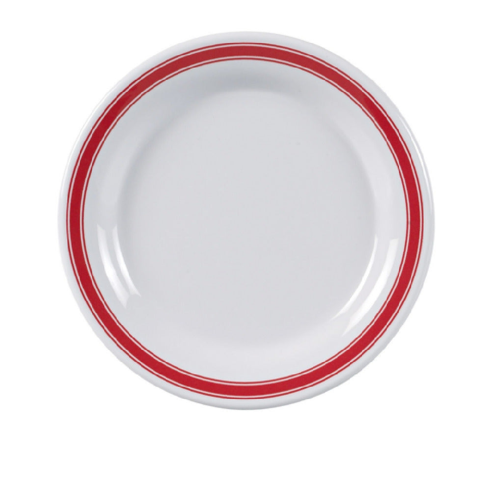 The Yanco HS-106 Houston Plate 6-1/2" Dia. Round is a meticulously designed piece of tableware that combines functionality with durability, catering to the diverse needs of the food service industry. This round plate, with a diameter of 6-1/2 inches, is crafted from extra heavy weight melamine, ensuring robust performance while maintaining a lightweight feel. Distinguished by its red band and white design, it adds a touch of elegance to any dining setting. The Yanco HS-106 is dishwasher safe, making it an ideal choice for establishments that prioritize efficiency and convenience in their operations. The product is strategically packed by 4 dozen per case, optimizing inventory management and distribution for businesses. This plate is particularly well-suited for high-traffic environments such as restaurants, cafeterias, and catering services, where durability and ease of maintenance are paramount. Its sturdy construction and aesthetic appeal make it a versatile addition to any tableware collection. The Yanco HS-106 Houston Plate not only meets the functional requirements of food service professionals but also enhances the dining experience with its stylish design and reliable quality. Its blend of heavy-duty material and practical design ensures it stands up to the rigorous demands of the industry while maintaining its visual appeal.