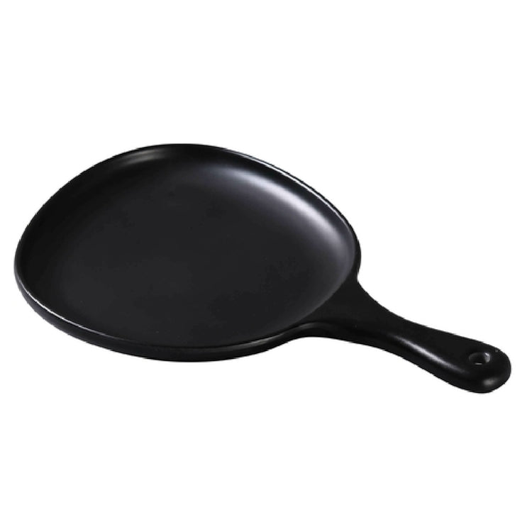 The Yanco MO-810BK Moderne Pan Plate is a uniquely designed serving solution that measures 12 inches in length, 8 inches in width, and 1 inch in height. Its organic shape, combined with a convenient handle, makes it a distinctive choice for various food service settings. Crafted from durable melamine, this pan plate features a sleek matte finish in black, offering a modern aesthetic that complements a wide range of dining environments. The product is dishwasher safe, ensuring ease of cleaning and maintenance, which is particularly beneficial for busy commercial kitchens. Sold by the case and packed by the dozen, the Yanco MO-810BK is ideal for catering to large-scale operations such as restaurants, hotels, and catered events, where both style and functionality are paramount. Its sturdy construction and elegant design make it suitable for upscale dining experiences, while its practicality and durability meet the demands of high-volume service. This pan plate is a versatile addition to any culinary establishment looking to enhance their tableware collection with a product that balances innovative design with reliable performance.