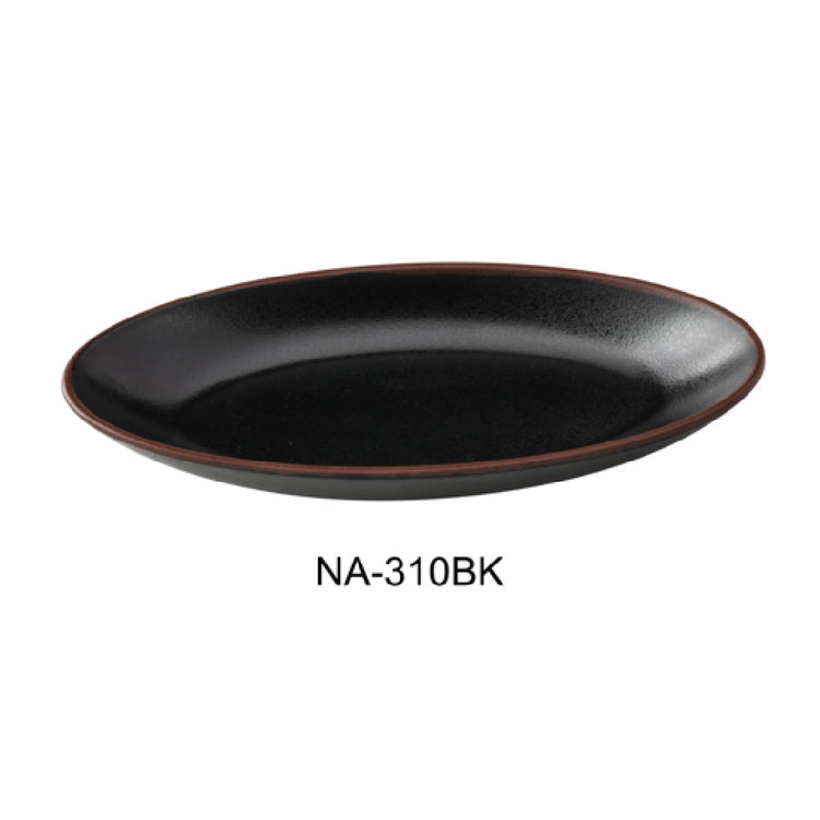 The Yanco NA-310BK Nature Art Appetizer/Salad Plate is an elegantly designed oval dish measuring 10-1/2 inches wide, 5-1/4 inches deep, and 1-1/2 inches high. This plate is particularly notable for its robust melamine construction, which provides the dual benefits of durability and being dishwasher safe, making it a practical choice for high-traffic environments such as restaurants and catering businesses. The deep design offers ample space for appetizers and salads, ensuring a versatile dining experience. Aesthetically, it features a sophisticated black color with a brown accent, adding a touch of elegance to any table setting. Sold by case and packed by 2 dozen per case, this product is ideal for businesses looking to maintain a consistent and stylish presentation. The Yanco NA-310BK's combination of visual appeal and practical features makes it a valuable asset in the food service industry, catering to both functionality and design needs of different market segments.