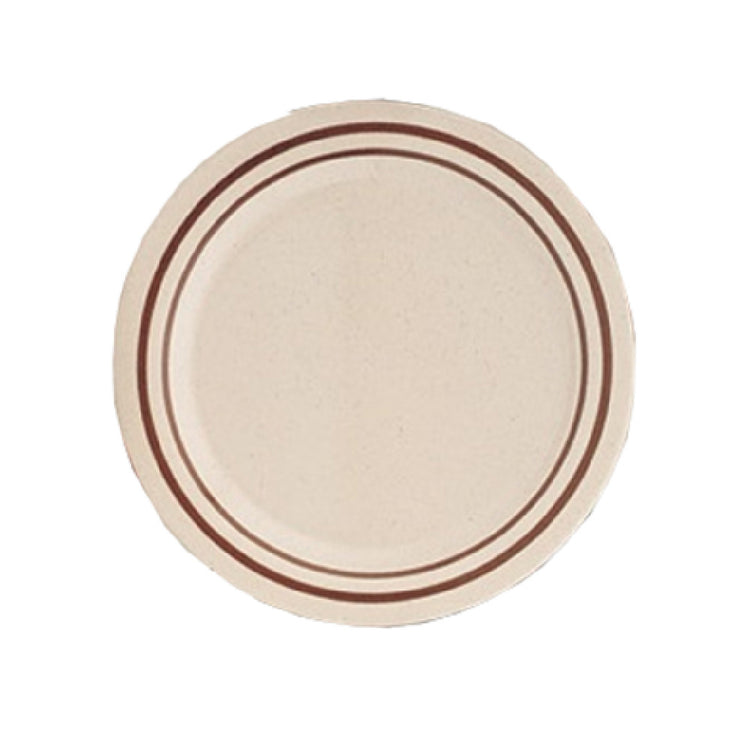The Yanco SS-110 Sesame Dinner Plate 10" Dia. Round is a versatile and durable dining solution, specifically crafted to meet the demands of various market segments in the food service industry. Measuring 10 inches in diameter, this round dinner plate offers ample space for presenting a wide array of culinary creations, from main courses to appetizers. Constructed from extra heavy weight melamine, the plate combines strength and resilience, ensuring it withstands the rigors of daily use in busy restaurants, catering events, and institutional dining settings. The brown band on a beige background provides an elegant and timeless aesthetic, suitable for both casual and upscale dining environments. Dishwasher safe, the Yanco SS-110 is designed for convenience, allowing for efficient cleaning and maintenance without compromising its visual appeal or structural integrity. Meeting NSF standards, it aligns with industry health and safety regulations, making it a reliable choice for professional kitchens. Sold by the case, with each case packed by 2 dozen, this dinner plate is an economical option for establishments seeking quality and functionality. The Yanco SS-110 Sesame Dinner Plate stands out as a practical investment for enhancing dining experiences across different sectors.