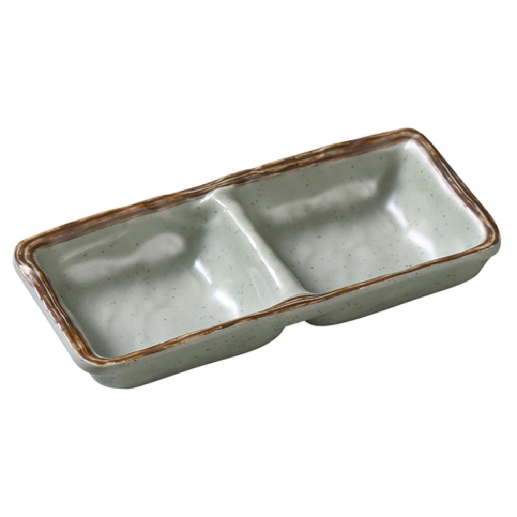 The Yanco YO-4031 Yoto Double Sauce Dish is a meticulously designed serveware piece featuring two 5 oz. compartments, ideal for portioning sauces or condiments with precision. Measuring 6 inches in length, 2-3/4 inches in width, and 3/4 inches in height, this rectangular dish is crafted from durable melamine, ensuring longevity and resistance to breakage. The dish is finished in an elegant matte green, adding a touch of sophistication to any dining setup. It is dishwasher safe, making it convenient for both commercial and home kitchen use, where quick and efficient cleaning is a priority. Sold by the case, with each case containing 4 dozen dishes, it is suitable for large-scale operations such as restaurants, catering services, or hotel kitchens that require bulk quantities. The Yanco YO-4031 caters to various market segments within the food service industry by offering a practical solution for serving multiple sauces simultaneously, thus enhancing the dining experience. Its robust construction and stylish appearance make it a valuable addition to any culinary establishment looking to combine functionality with aesthetic appeal.
